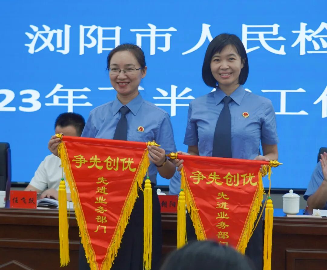 会议通报表彰了2023年二季度优秀部门和先进个人,部署了党风廉政建设和反腐败工作,印发了《浏阳市人民检察院关于开展“两带头五整治”纠风防腐专项行动的方案》、《浏阳市人民检察院关于开展“守法普法大提升”普法小分队活动工作方案》。