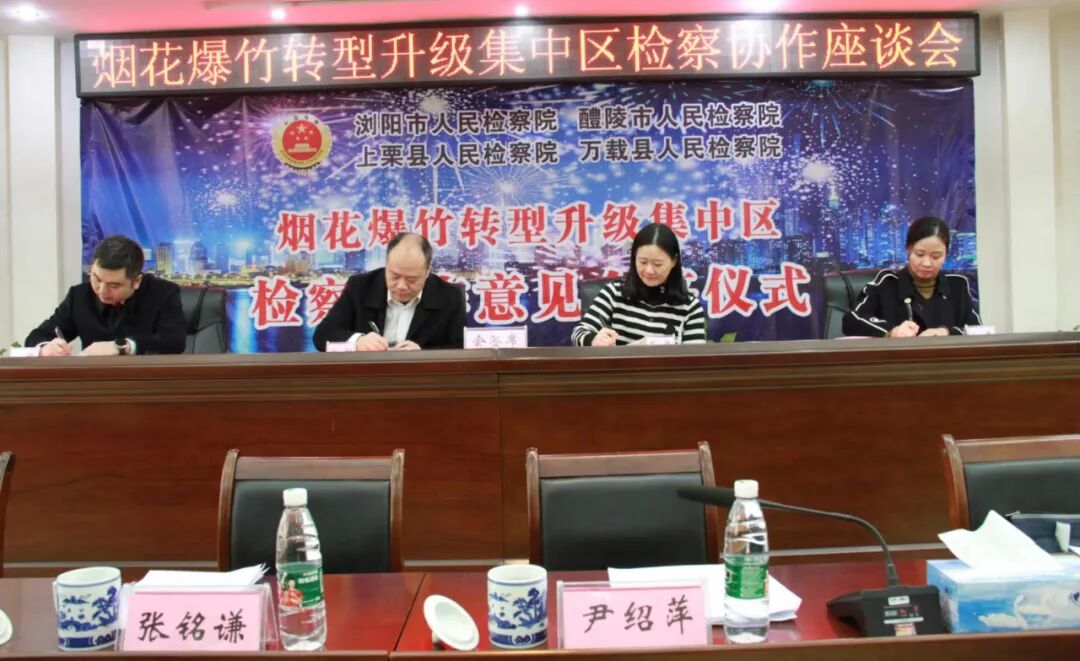 会上,四地检察机关会签了《关于加强烟花爆竹转型升级集中区检察协作的意见》。《意见》聚焦平等保护合法、从严打击非法、统一办案标准、加强线索移送、推进社会共治、开展检察协助、联合教育培训、建立宣传矩阵八项重点协作任务,围绕成立工作小组、建立联席会议、开展业务交流等方面建立协作机制。