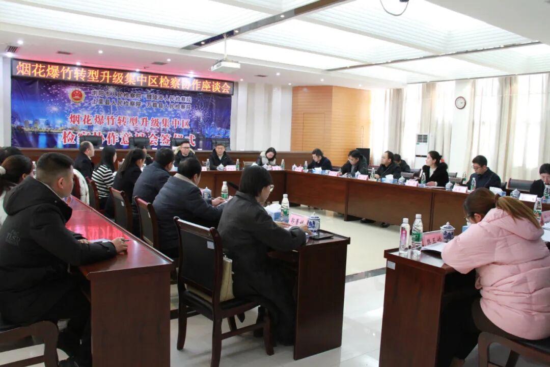 1月25日,浏阳市检察院党组书记、检察长罗朝阳带队到上栗县检察院参加烟花爆竹转型升级集中区检察协作交流活动,浏阳、醴陵、上栗、万载等两省四地检察机关共商新时代检察联动协作,助推湘赣边烟花爆竹转型升级集中区建设。