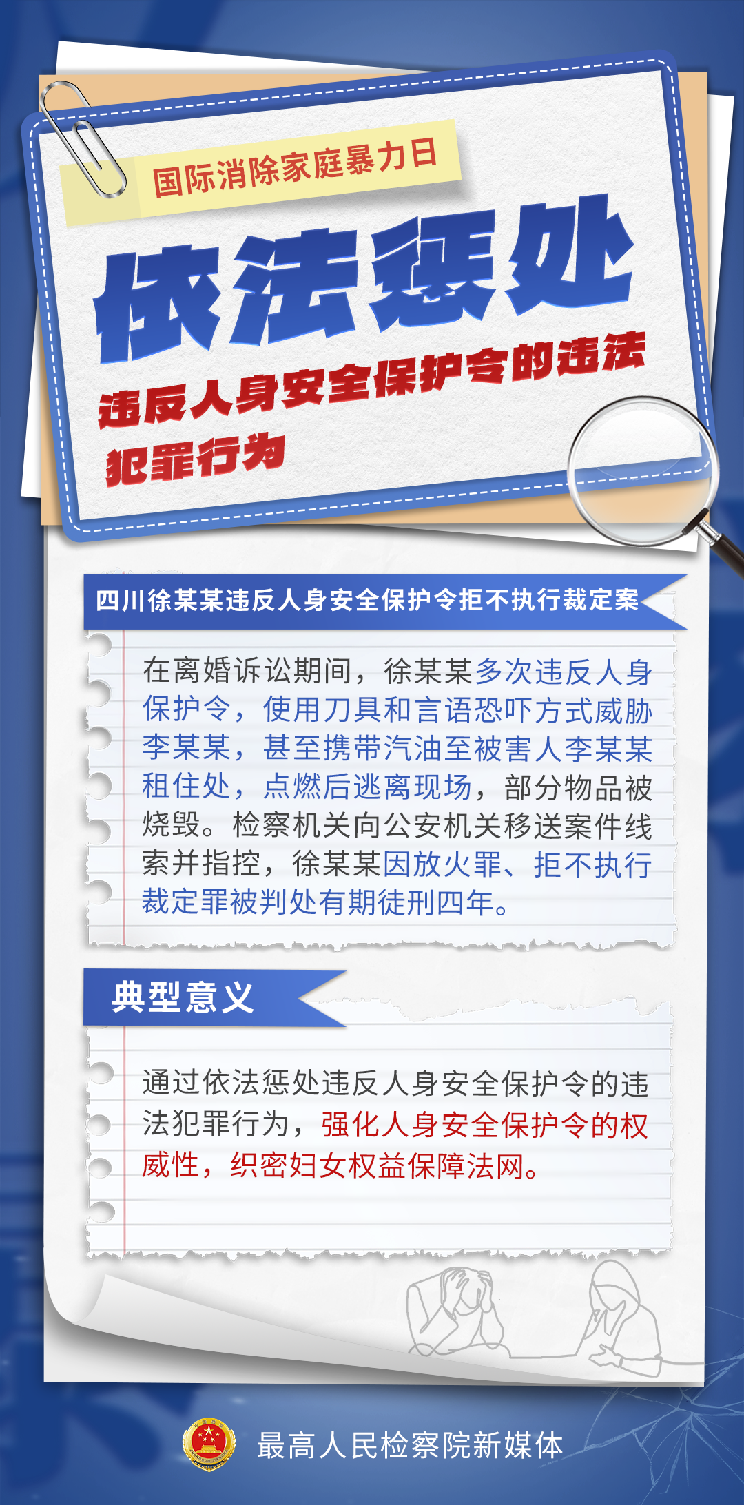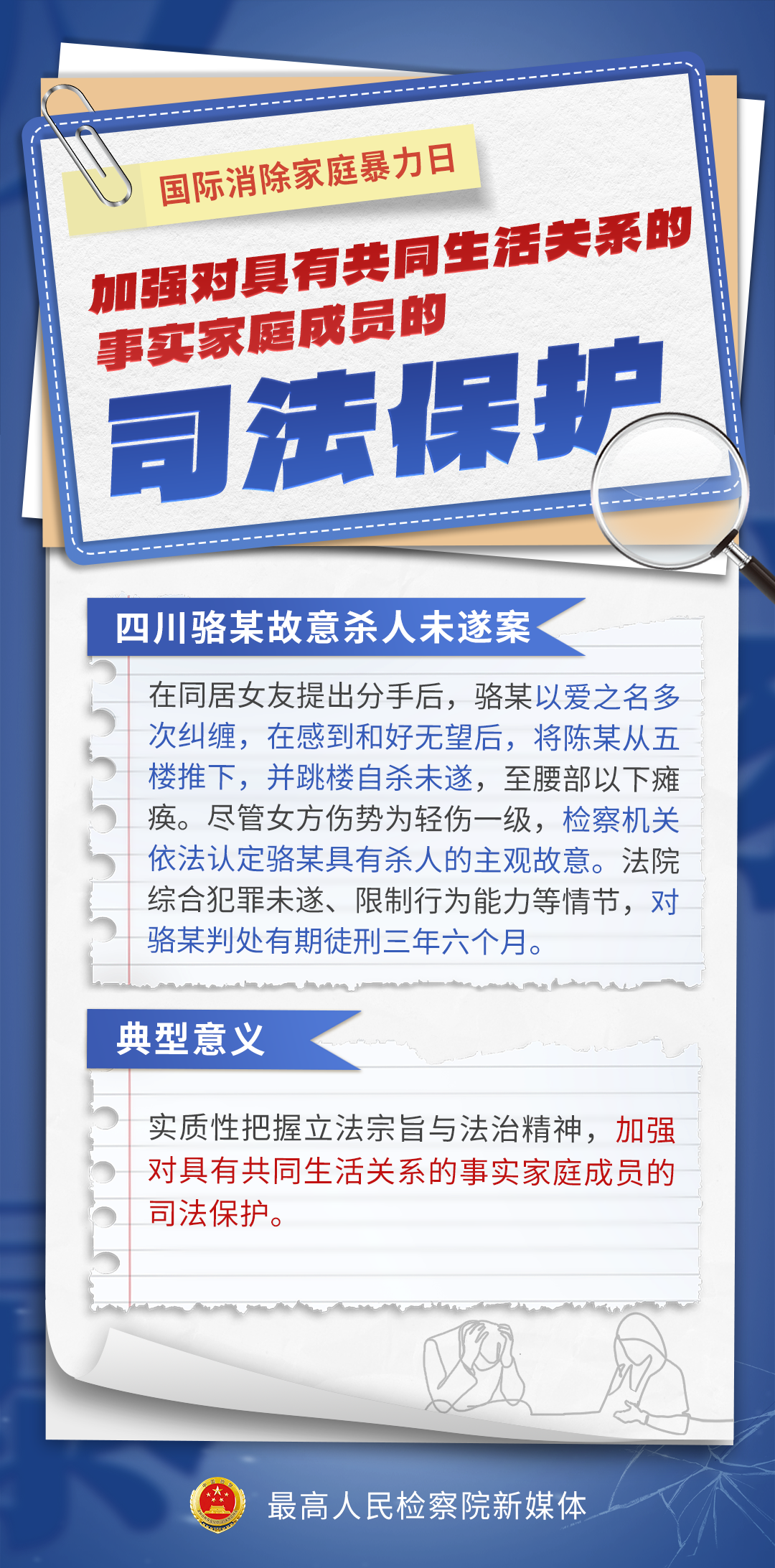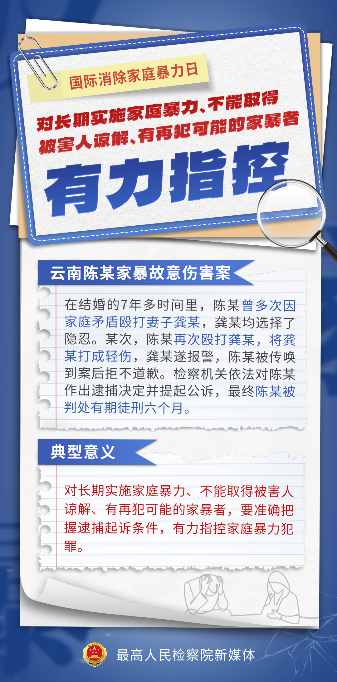 11月25日,在第21个“国际消除家庭暴力日”来临之际,最高检选出七起发生在全国多地、具有典型意义的反家暴案例。反家暴案件的办理,也是全国检察机关“检护民生”专项行动成效的生动体现。检察日报社记者对此进行了专访。“家暴不是‘家事’”。一组海报,带您了解案件详情!