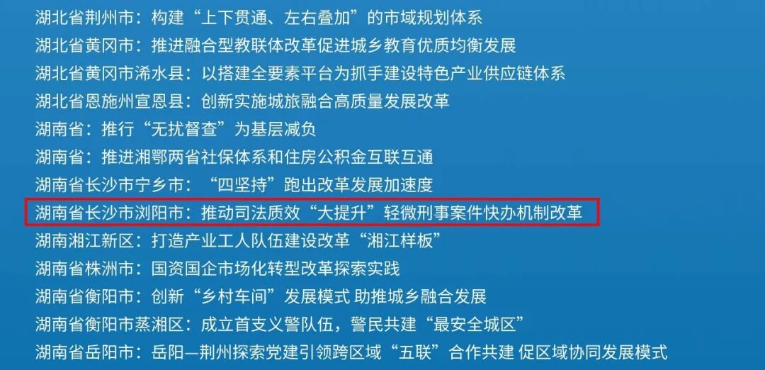 12月18日,在辽宁省沈阳市举办的中国改革(2024)年会暨进一步全面深化改革地方实践高层研讨会上,中国经济体制改革杂志社发布了“中国改革2024年度案例征集活动”案例名单。《湖南省浏阳市:推动司法质效“大提升” 轻微刑事案件快办机制改革》入选中国改革2024年度案例征集活动“地方全面深化改革典型案例”。