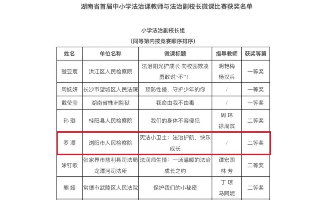 近日,由省教育厅主办,省高院、省检察院、省公安厅、省司法厅协办的“湖南省首届中小学法治课教师与法治副校长微课比赛”在长沙落下帷幕。经过层层选拔,浏阳市检察院第一检察部干警罗漂《宪法小卫士--法治护航,快乐成长》微课程,凭借创新的情境式课程设计和生动的课堂呈现,在全省法治副校长的激烈角逐中,过关斩将,勇夺中小学法治副校长小学组二等奖。