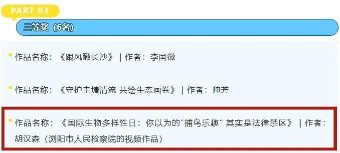 2025年8月15日,浏阳市检察院短视频作品《国际生物多样性日:你以为的“捕鸟乐趣”其实是法律禁区》在长沙市生态环境局主办的2025年“星城绿韵 万物共生”短视频大赛中获三等奖。