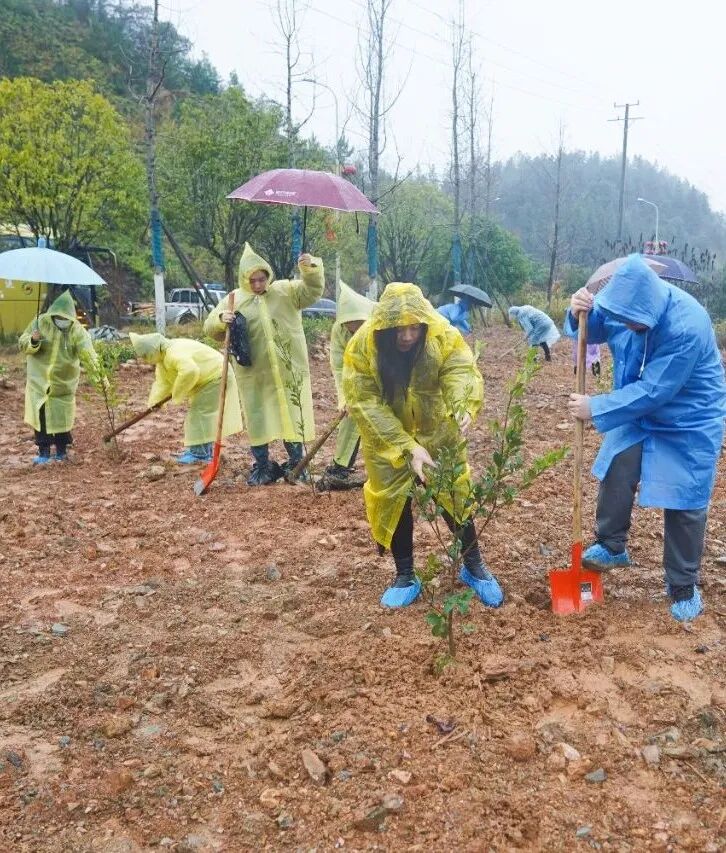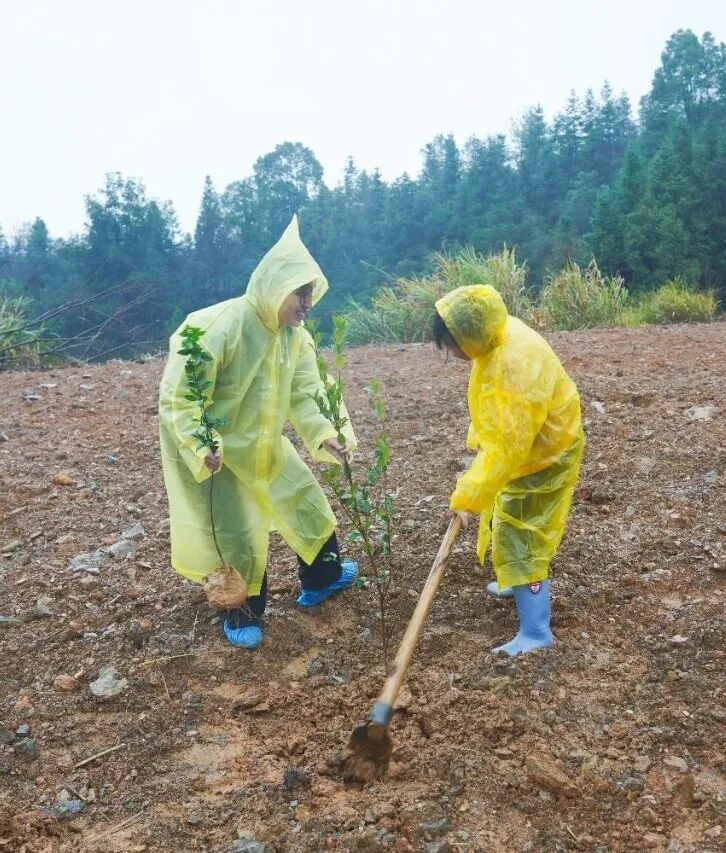 活动当天,浏阳市检察院30余名青年志愿者来到义务植树基地,一大块平整的黄土地映入眼帘,旁边摆放着一排排树苗和劳动工具。志愿者们热情高涨,穿上雨衣,投入到紧张而有序的植树工作中。踏着泥泞的土地,大家分工协作,有的挥锄挖土,有的扶正树苗,有的培土围堰,每个环节都一丝不苟。任凭手脚沾满了泥土,志愿者们热情丝毫不减,干劲十足,一个个身披雨衣的志愿者,共同奋战在春雨的沐浴中,构成一幅热火朝天的画面。